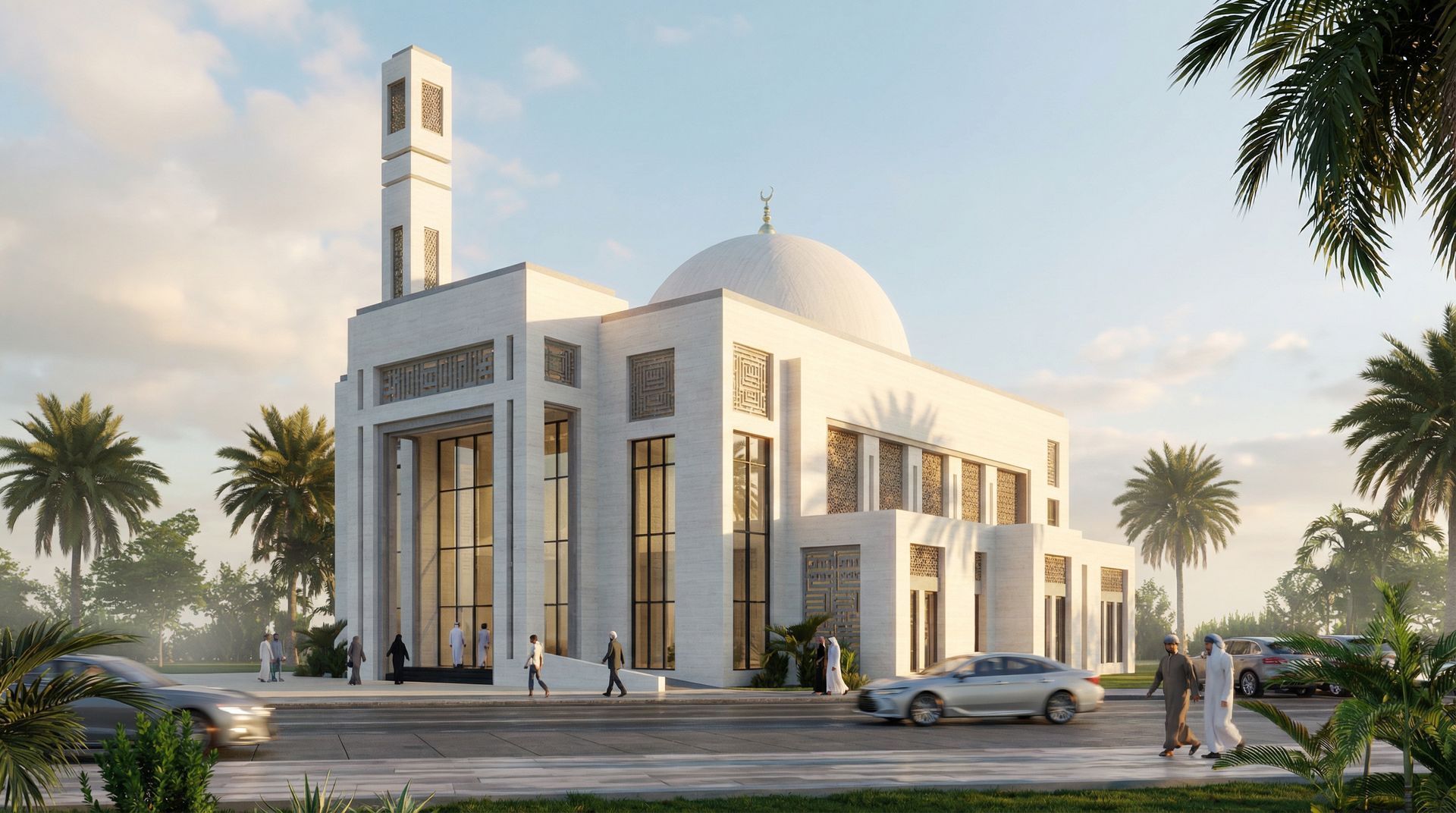 Urban Integration: The mosque is positioned as a landmark along a main road while remaining accessible, welcoming, and pedestrian-friendly.