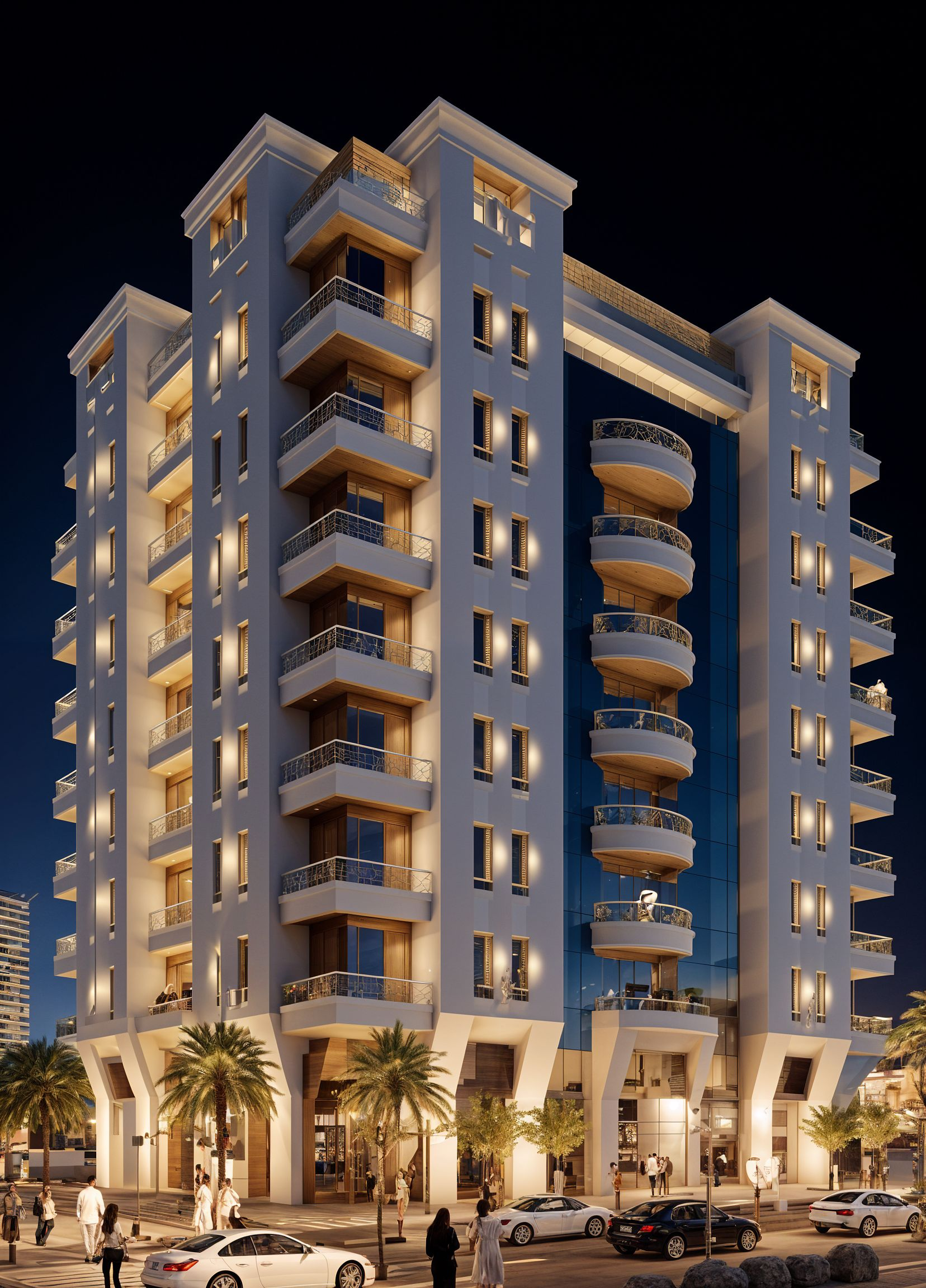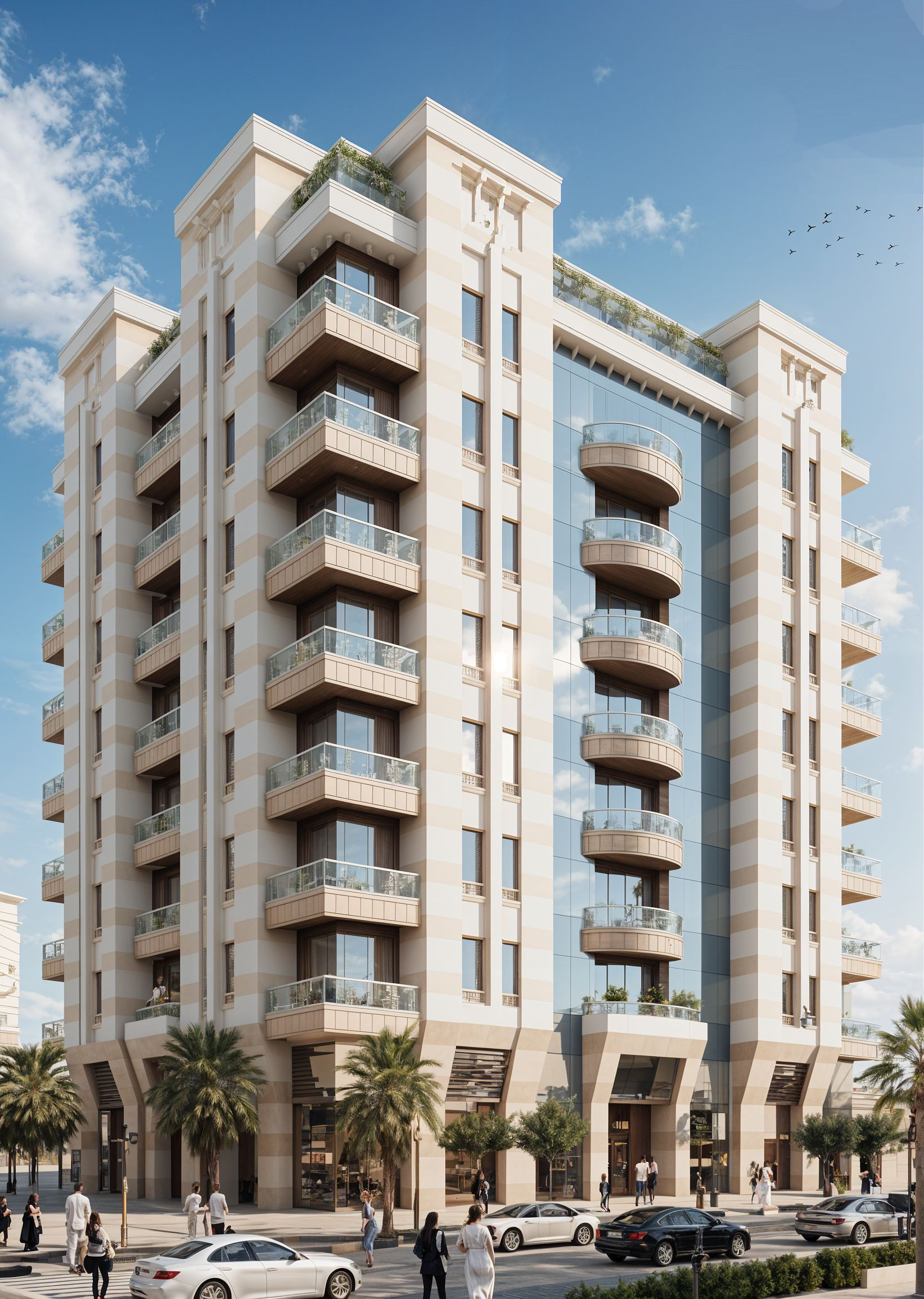 At street level, vibrant commercial spaces connect seamlessly with the pedestrian lifestyle, inviting cafés, boutiques, and services that energize the community. Above, spacious residences with open balconies overlook palm-lined streets, offering views of both the skyline and the daily rhythm of city life.