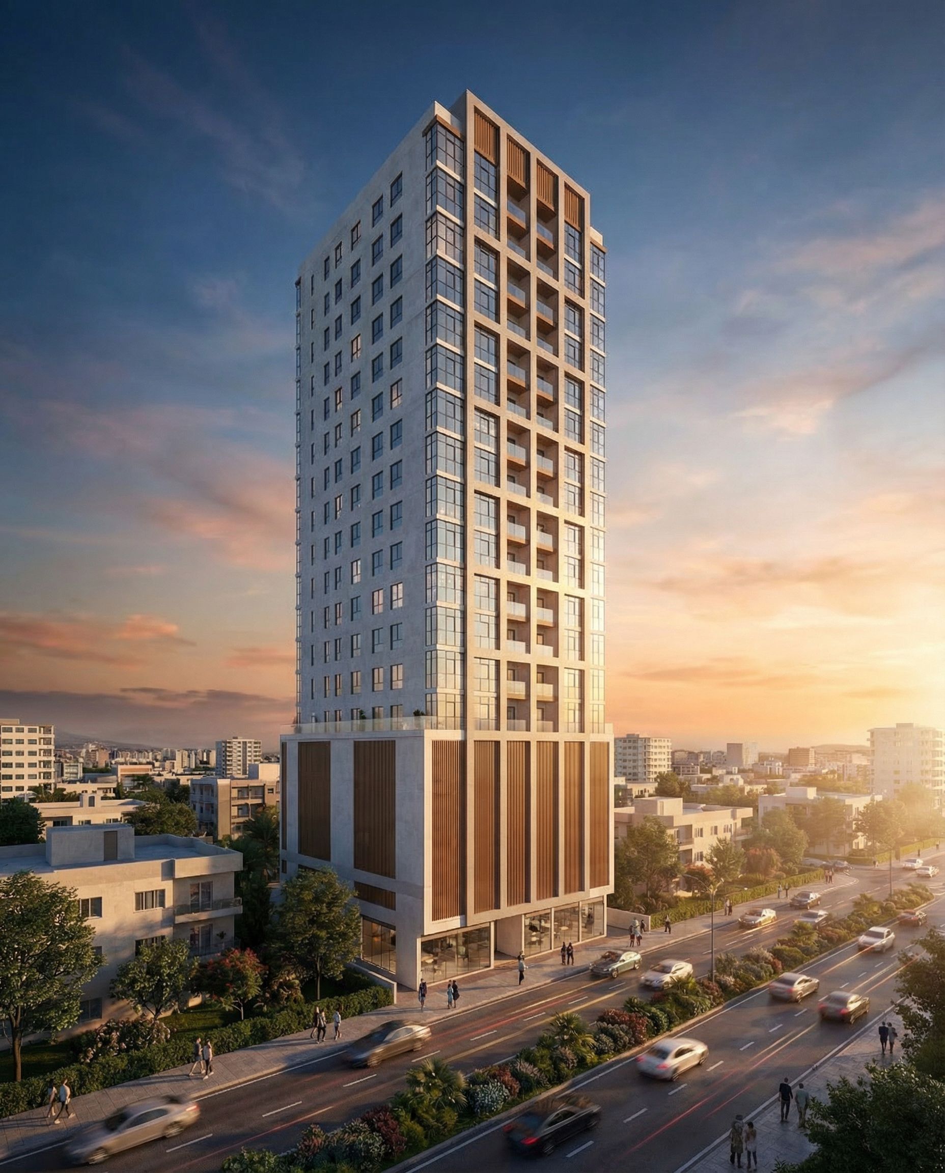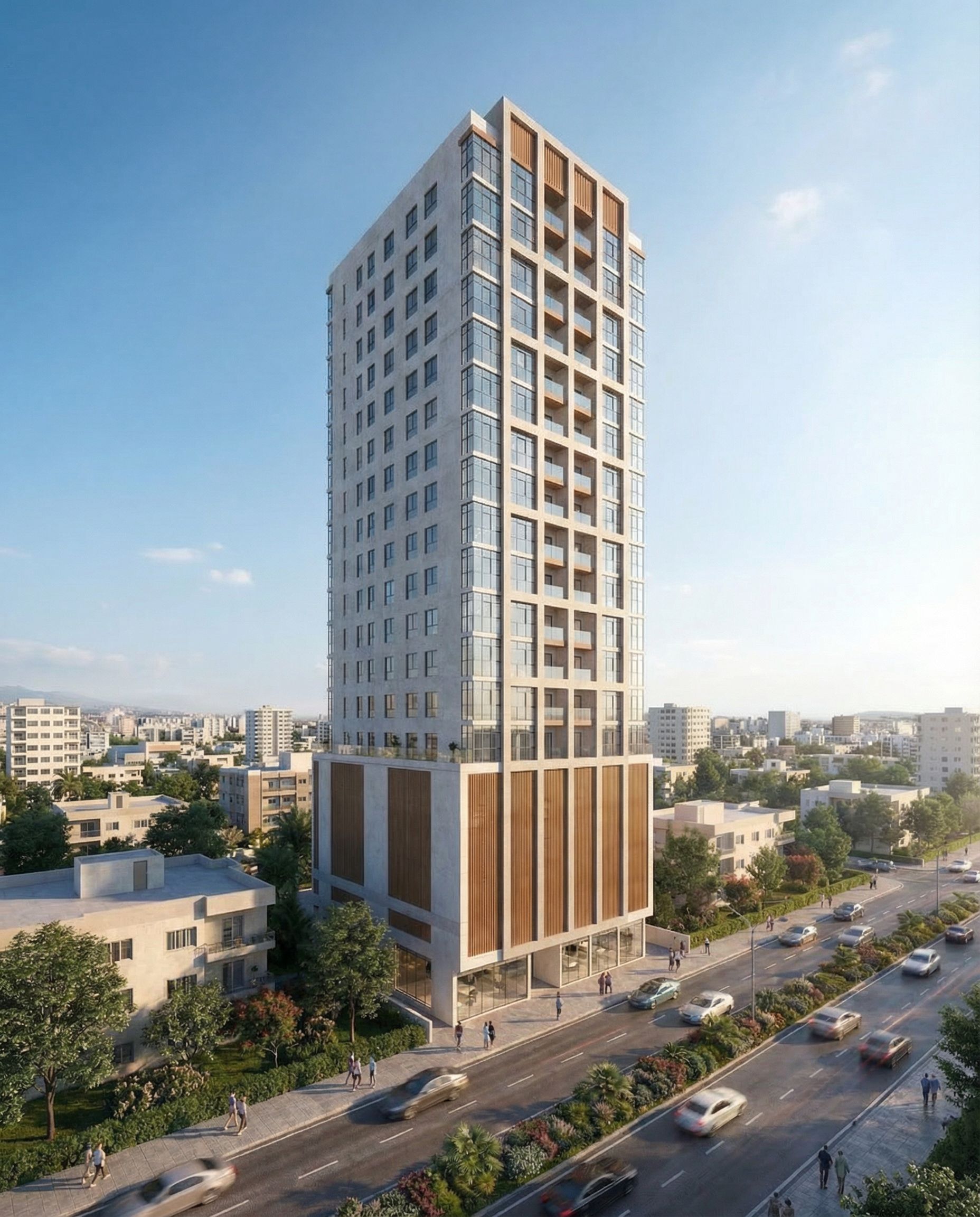 The architecture speaks in measured lines and warm textures: a refined stone façade, rhythmic vertical louvers, and generous glazing that frames the city without overpowering it. At its base, the building opens to the street with transparency and human scale, inviting life, movement, and connection. Above, the residences ascend into calm, private sanctuaries elevated from the city’s pace.
